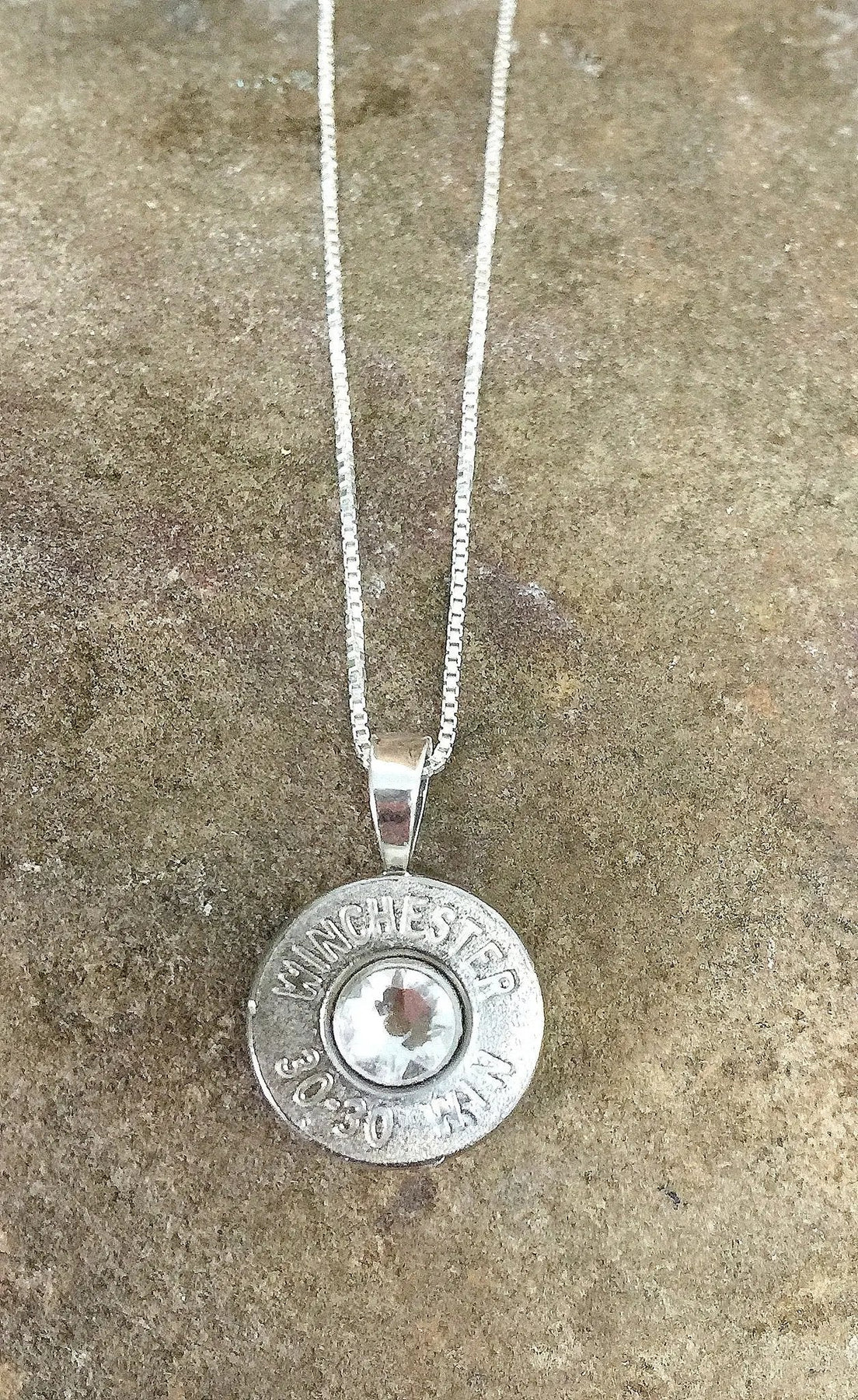 Our 30-30 Sterling Silver Bullet Head Necklace is made from a real, fired 30-30 bullet casing, genuine Swarovski Crystal and .925 sterling silver chain.  Your choice of chain length and crystal color.  Available in nickel or brass.