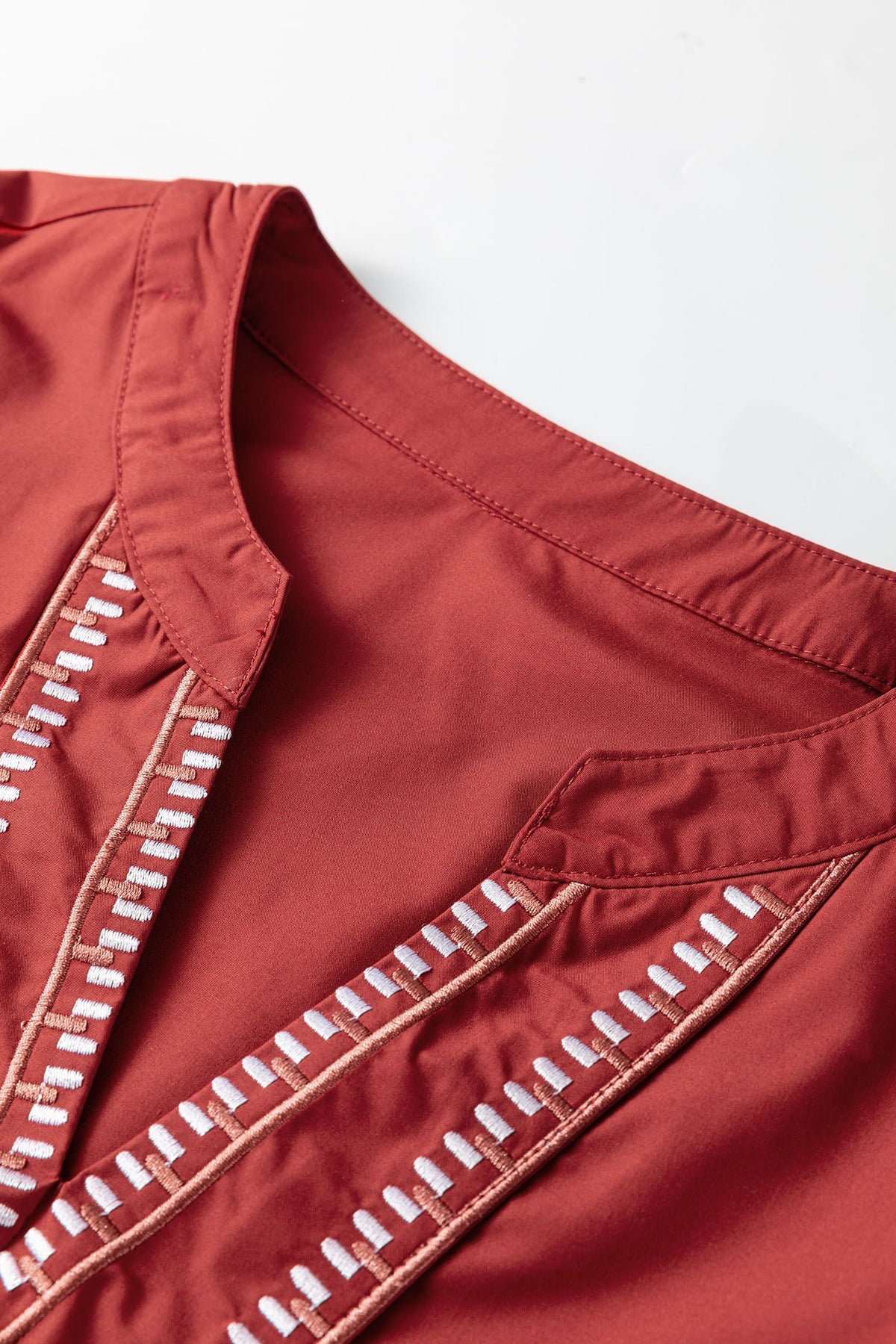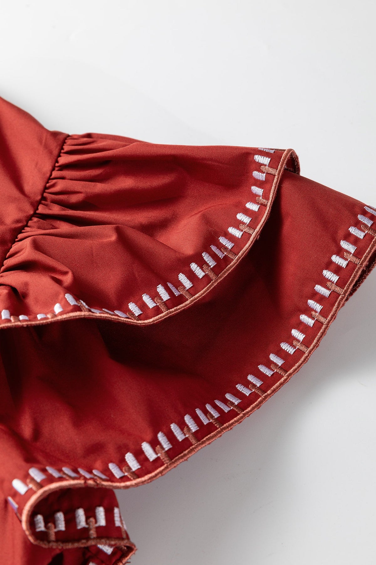 Dress in Andie Trim Flutter Sleeve Blouse when you want a relaxed fit that still feels polished. Add some sweet vibes to your look with this pretty blouse. This solid colored blouse has subtle embroidered details. Featuring a notched v neck and ruffle layered short sleeves. We love this special top paired with denim and chic accessories.