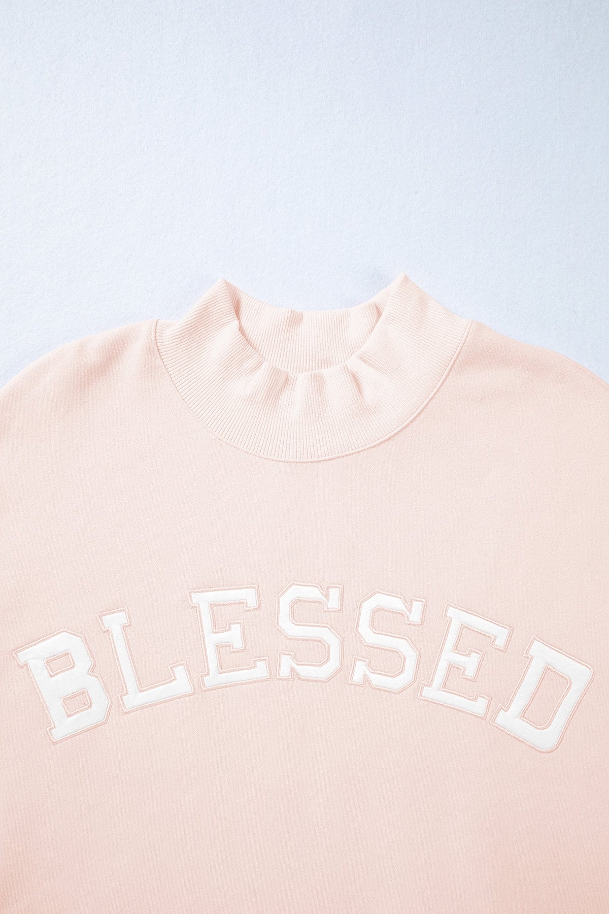 Reach for Sofia Blessed Embroidered Mock Sweatshirt whenever you want comfort, confidence, and simple styling. This baggy sweatshirt is cute with a light pink tone. The blessed embroidered graphic is perfect to make a statement. The mock neck design is classic and modest. Relaxed fit and casual for different body shapes.
