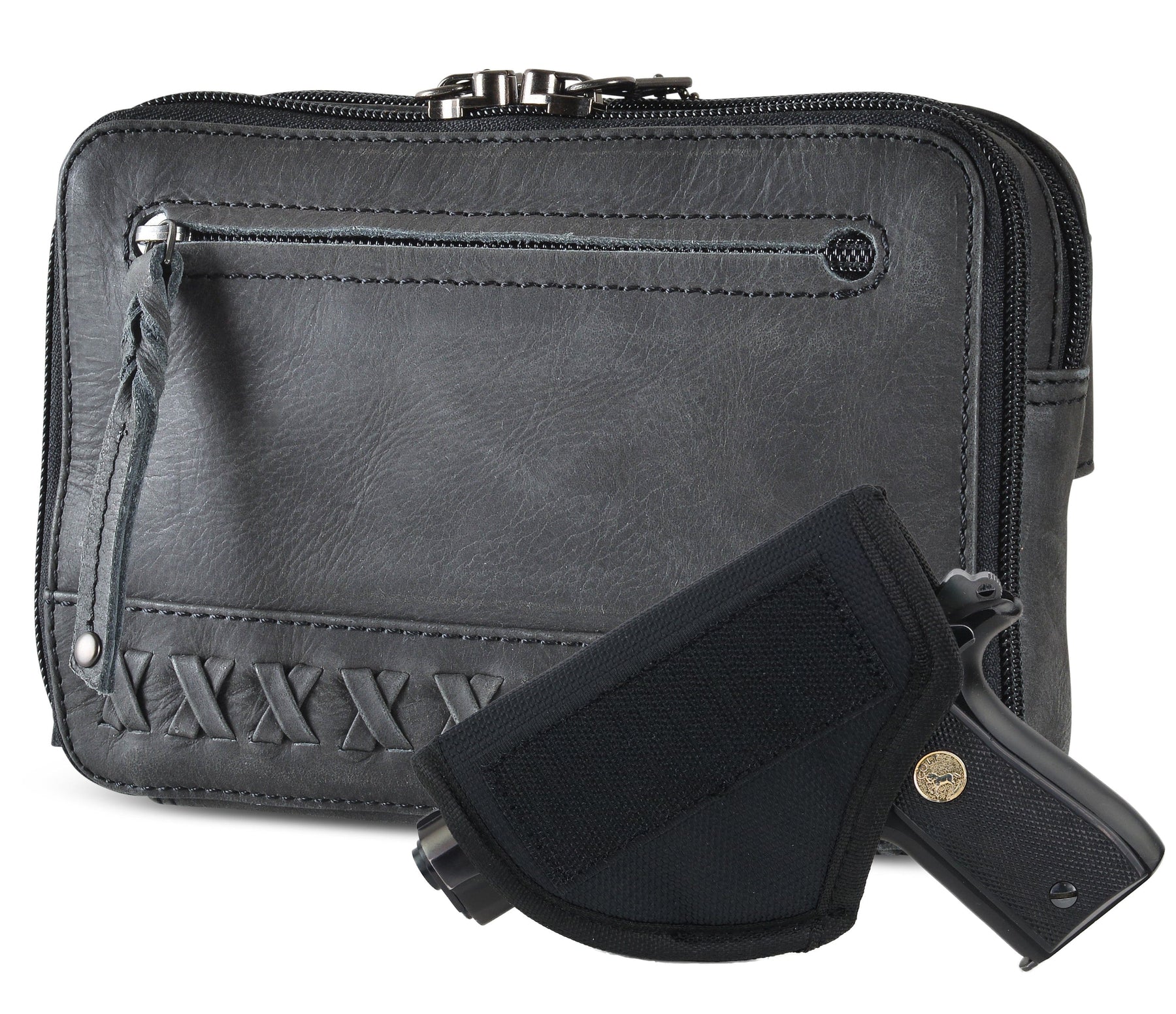 Product Summary: The Kailey purse pack is crafted with genuine buffalo leather or suede cowhide leather. This is far from your average fanny pack; its versatile design allows it to be worn as a sling for added style and convenience. Tk. The bag is highlighted with beautiful crisscross lacing or decorative studs. Unzip the front flap for easy access to your weapon. The interior features an RFID-protected organizer with 8 credit card slots, an open slip pocket, and a zippered pocket. An additional slip pocket on the back and a decorative zippered pocket on the front provide extra storage. Adjustable waistband measures 29" – 54" in total circumference, purse pack included.